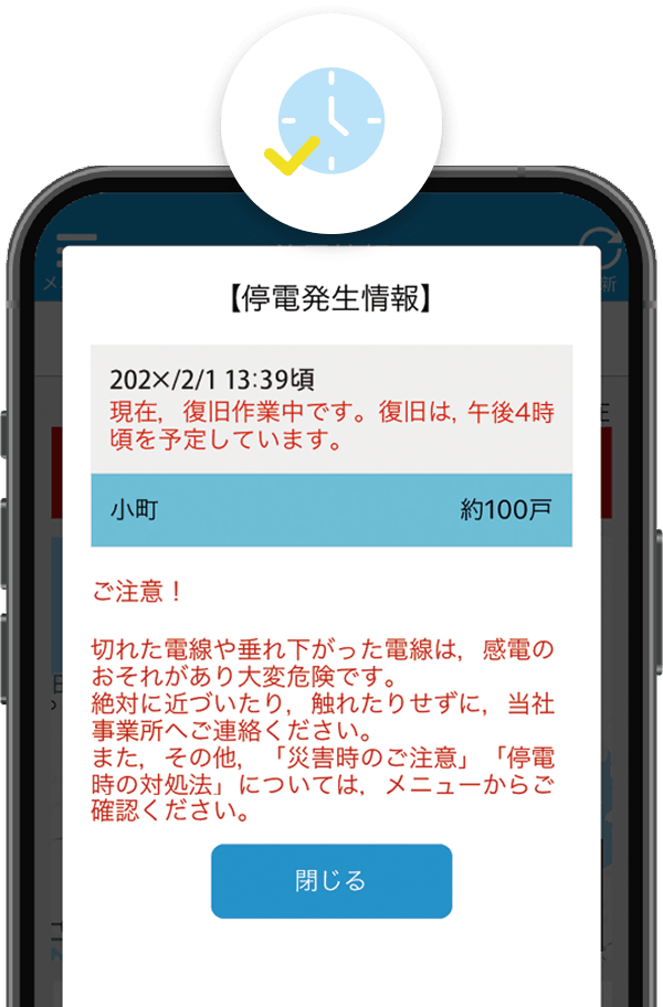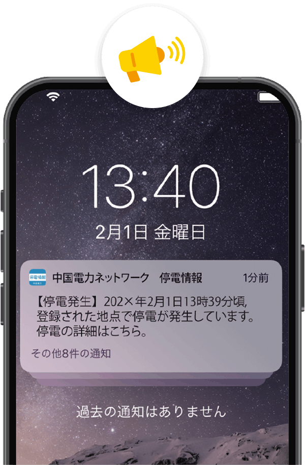 プッシュ通知でお知らせ 登録エリアに設定いただいた地域で停電が発生したときや、復旧した際にアプリを開かなくても情報が届きます。