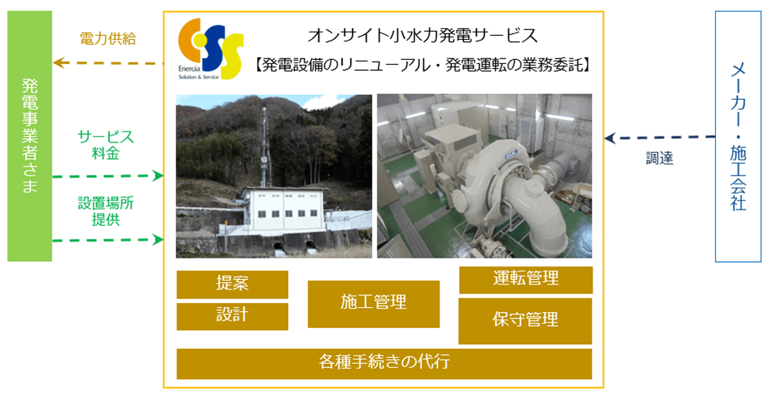 オンサイト小水力発電サービスは、初期投資とメンテナンス費用などお客さまのご負担なく、水力発電設備の改修ができるビジネスモデルです。