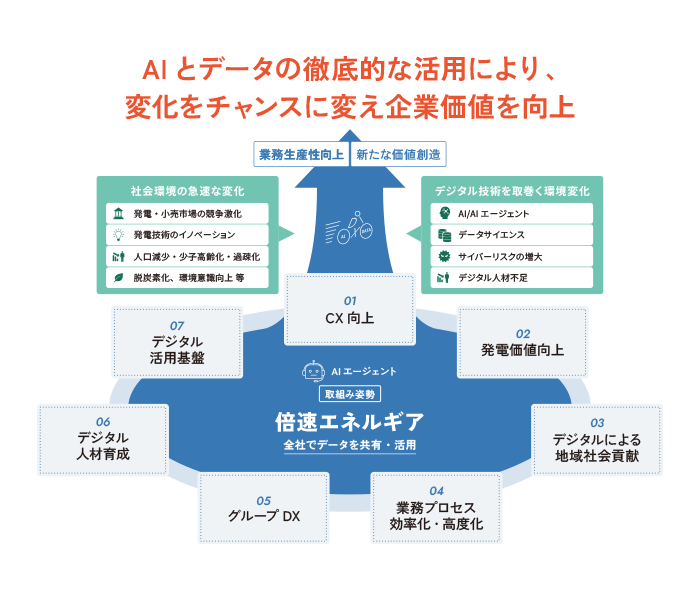 2026年度から2030年度にかけてのデジタル技術活用に関するグループの目指す姿と取組みの視点を示す“デジタル変革の羅針盤”として位置づけています。AIやデータの徹底的な活用により、圧倒的なスピードを獲得し、社会環境や技術の変化をチャンスに変える企業を目指します。取組み領域としては、CX向上、発電価値向上をはじめとする7つを掲げており、AIによる業務高度化とデータの全社的な活用を推進することで、変化への対応力と競争力を高めていきます。