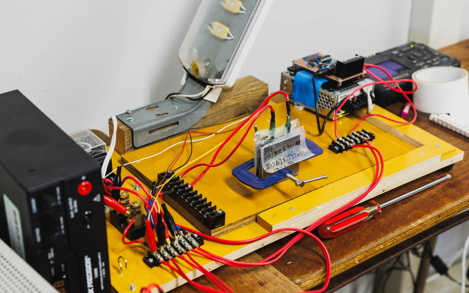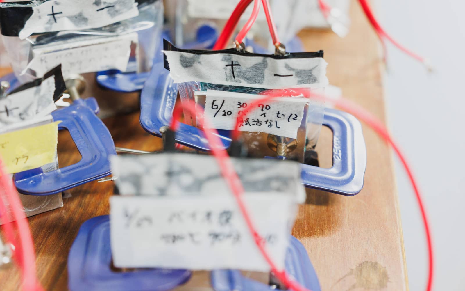常松さんたち学生は、木炭蓄電池の性能アップを目指して、日々いろいろな炭を使って研究を重ねています。