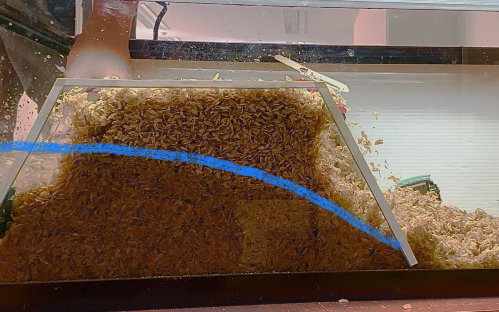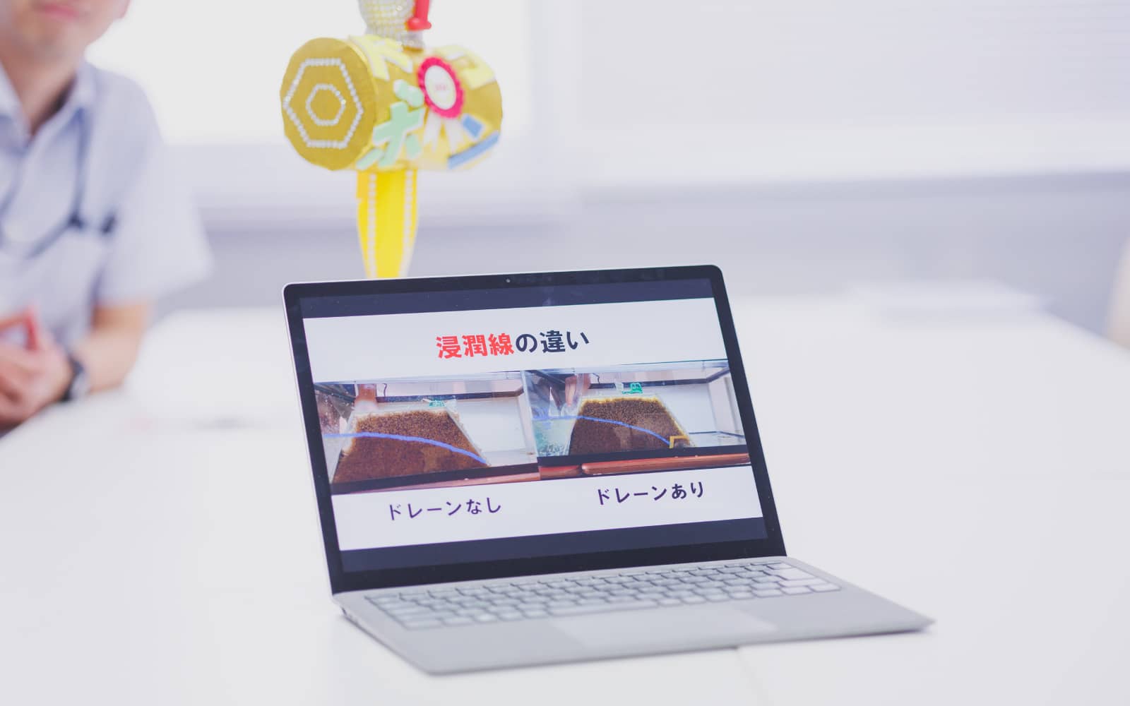 ドボクラブが製作したのは、堤防の決壊を防ぐドレーン(排水設備)。擬似の堤防は米のもみ殻で、ドレーンは金網・洗濯ネット・金属チェーンでつくられています。