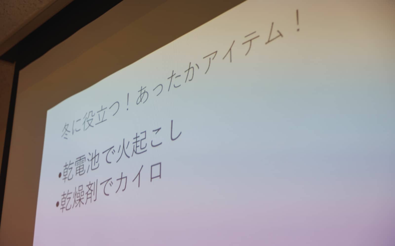 C班は2つのグッズをお披露目! 冬の災害時に役立つあったかアイテムをテーマに、乾電池を使った着火剤と、乾燥剤を活用した簡単カイロにチャレンジしました。
