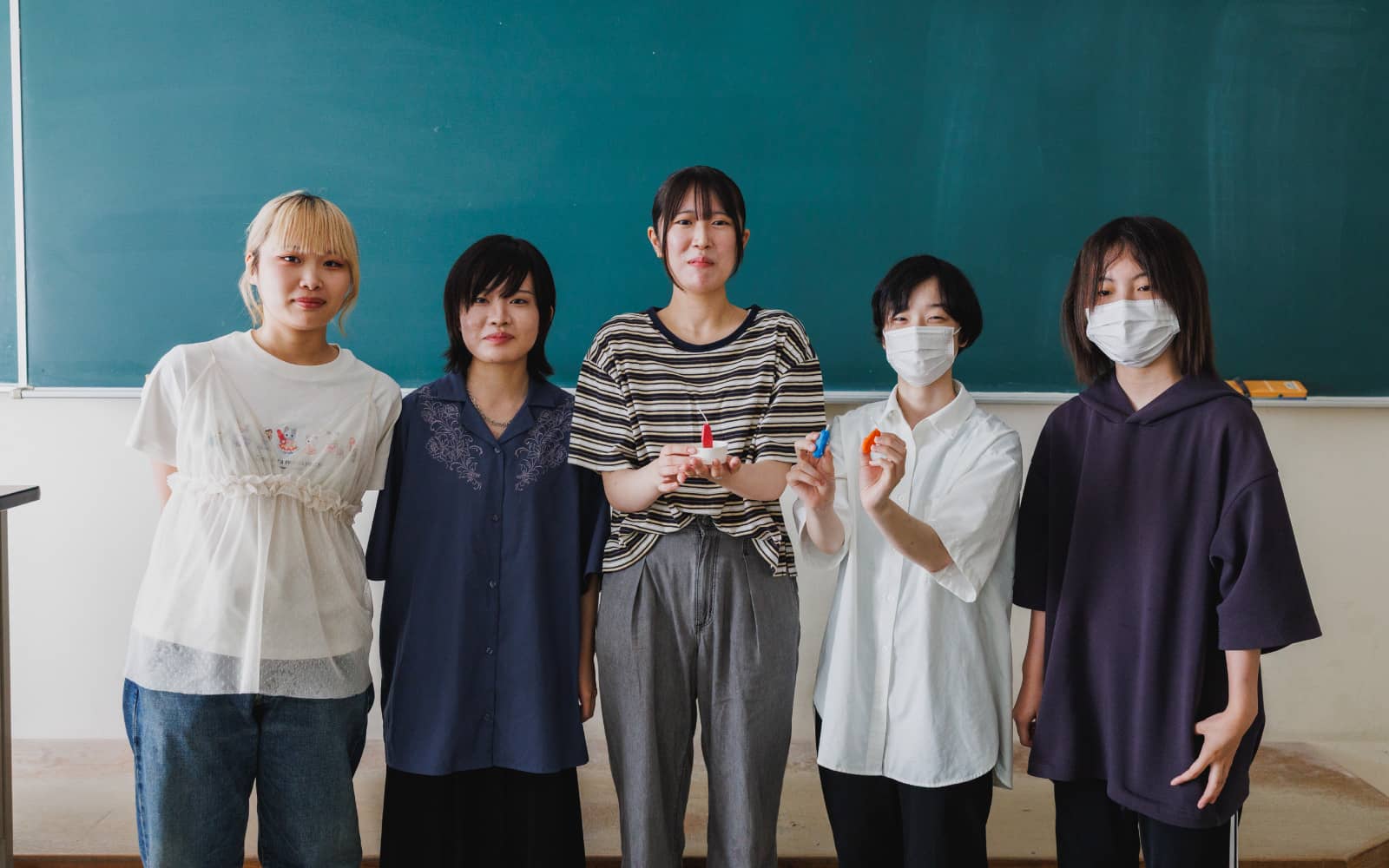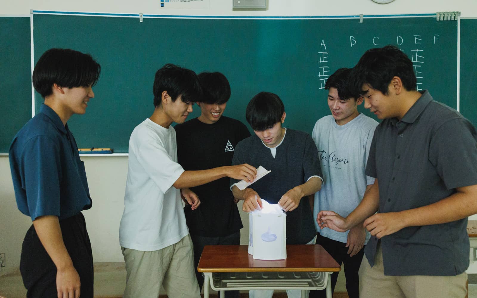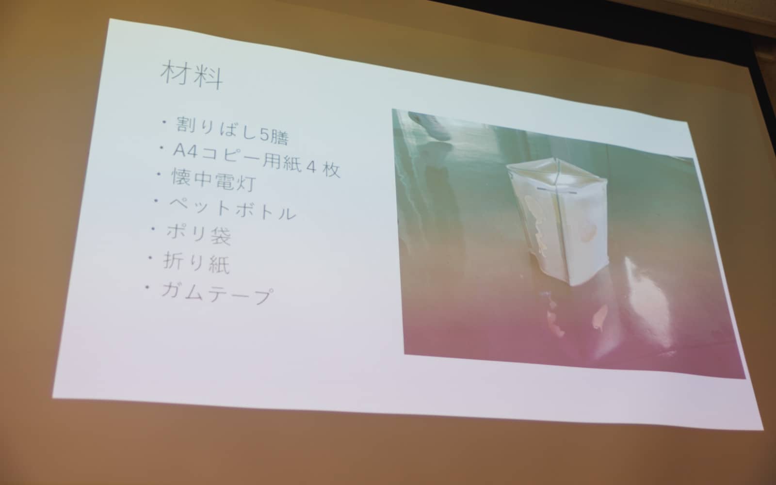 松江で恒例の夏イベント「灯ろう流し」も、アイデアのタネになったとのこと。『元々はランプをつくろうと思ってました。でも、せっかくなら松江の文化をみんなに知ってもらえたらと思って、灯ろうづくりに切り替えたんです。ポリ袋を被せるのは、授業で学んだ、光の拡散の知識を活かしてます!』