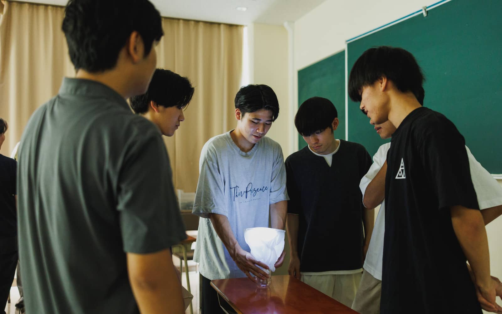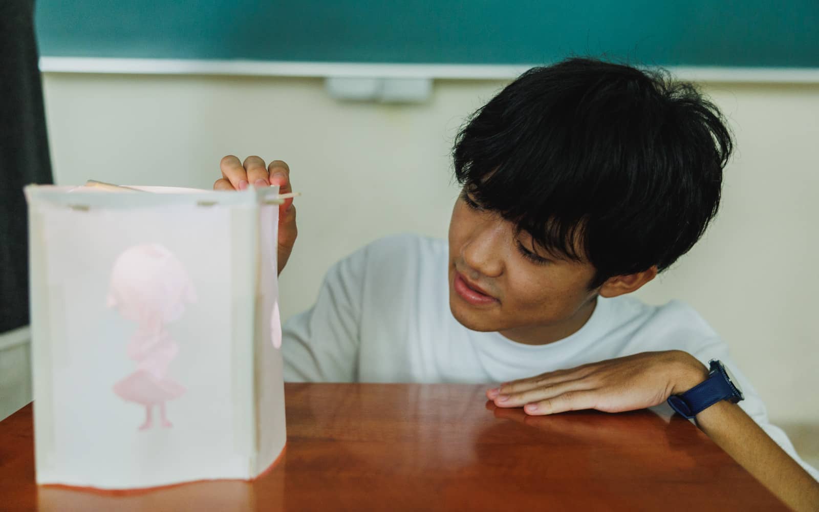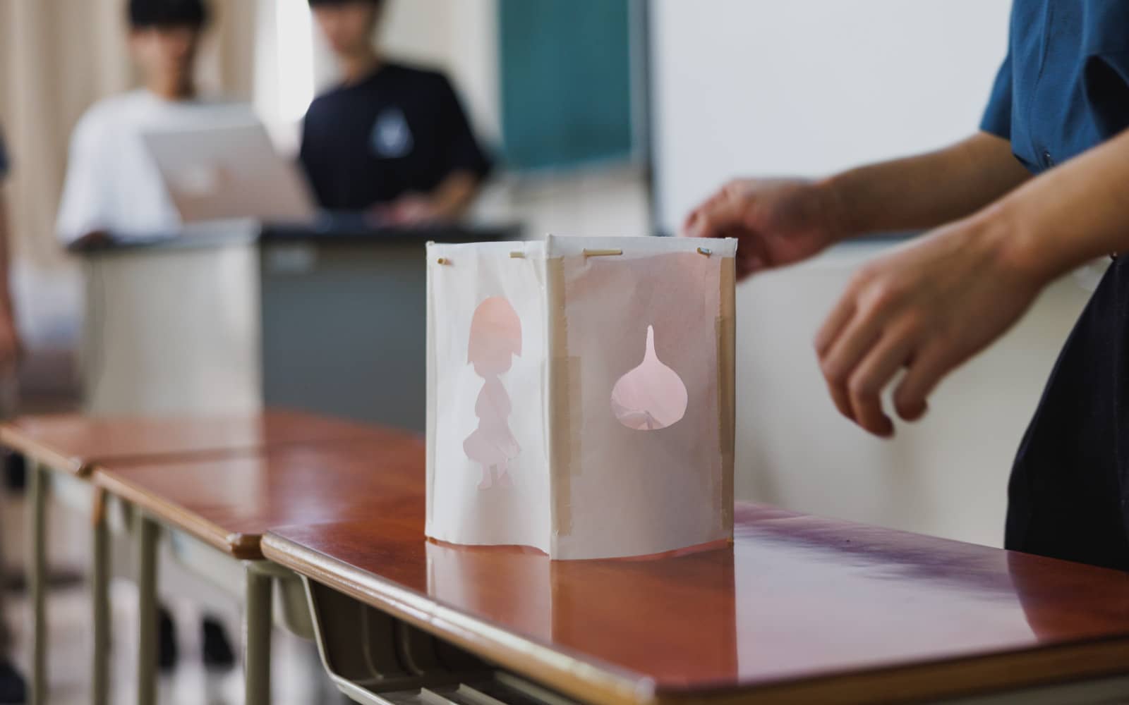 松江で恒例の夏イベント「灯ろう流し」も、アイデアのタネになったとのこと。『元々はランプをつくろうと思ってました。でも、せっかくなら松江の文化をみんなに知ってもらえたらと思って、灯ろうづくりに切り替えたんです。ポリ袋を被せるのは、授業で学んだ、光の拡散の知識を活かしてます!』