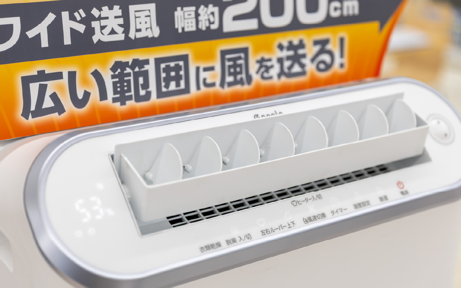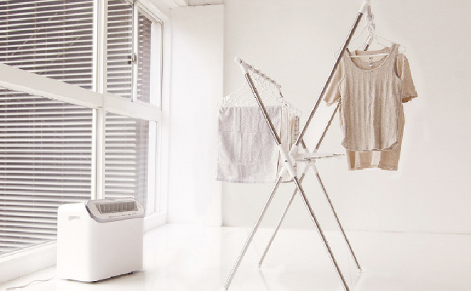 - コンパクトで、洗濯物の真下から効率的に洗濯物を乾燥。ナノイーXが部屋干し衣類を除菌し、部屋干し臭を抑制します。洗濯物が乾いた後も、お部屋の除湿をキープ。