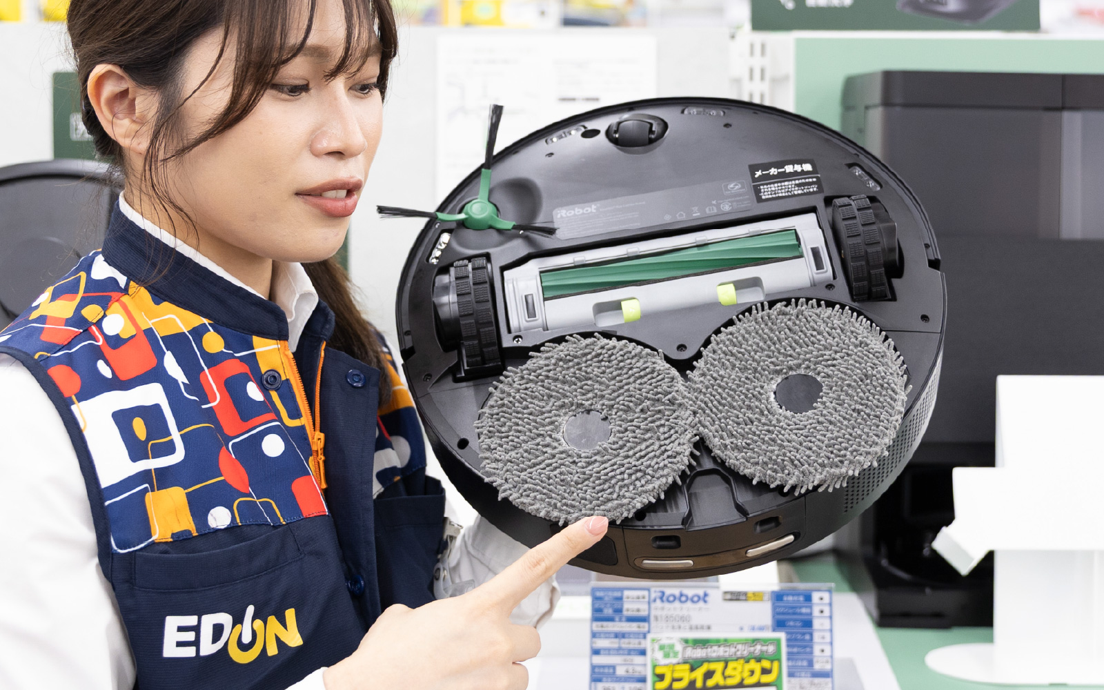 - パワフルな吸引力と拭き掃除で裸足で過ごすフローリングも快適に。伸縮するモップパッドで、壁際までキレイ。本体にたまったゴミの収集から、モップパッドの洗浄、乾燥まで全自動で手間いらず!