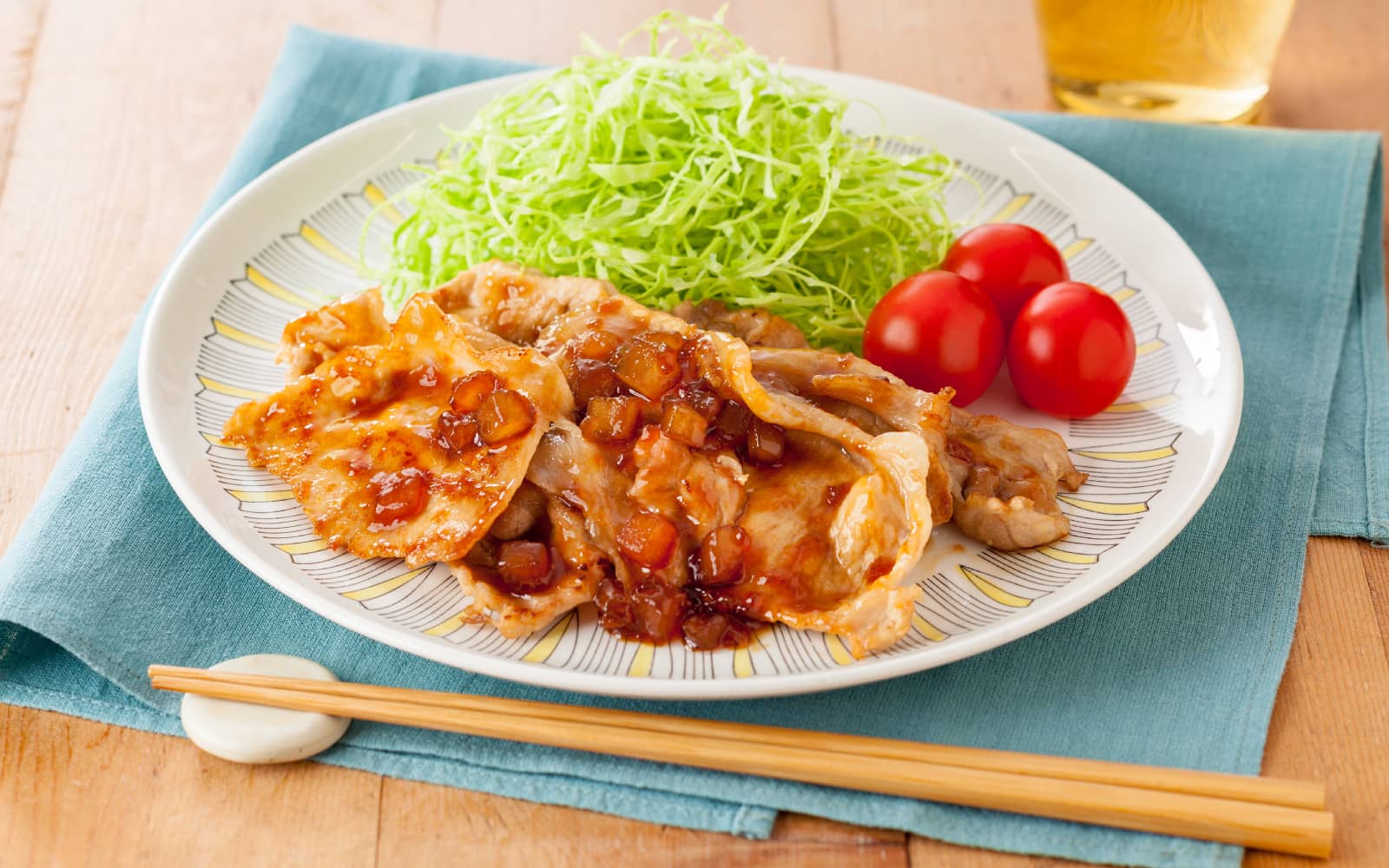 器に③を盛りつけ、せん切りキャベツとミニトマトを添える。