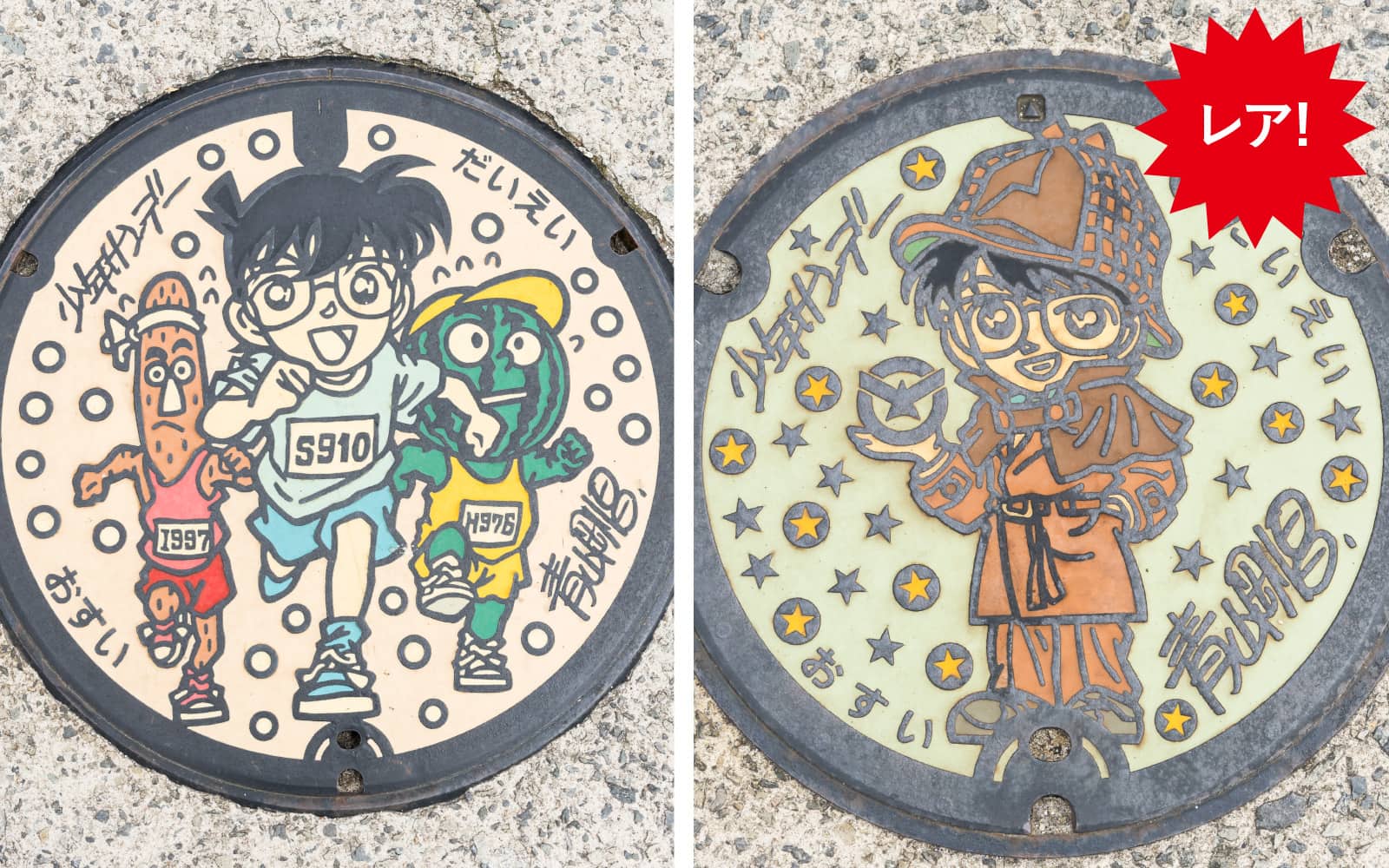 コナン通りにはコナンデザインのマンホールが設置されています。多くは「すいか・ながいも健康マラソン大会」デザイン(写真左)ですが、なかにはデザインが違う超レア版が! 聖地巡礼を楽しみながら、マンホール探しにも挑戦してみて!