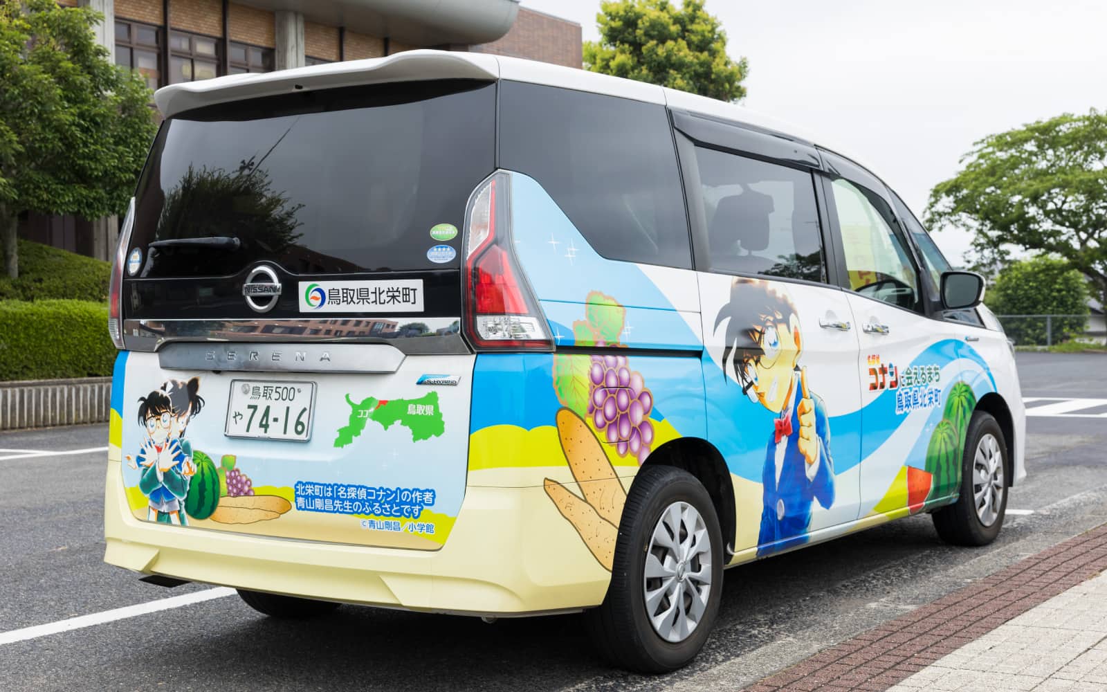 コナンくんデザインの公用車が北栄町を走っています。町の特産品も描かれたカラフルな車体は、四方向すべて違うデザインで、どの方向から見ても楽しめます! 出会えたら旅の思い出になること間違いなし。