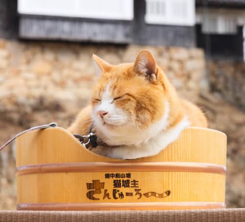 猫城主のさんじゅーろーは、今や備中松山城に欠かせない存在。10時と14時の見回り時間には、天守が建つ本丸に登場し、訪れた人たちを出迎えてくれます。とってもマイペースで愛くるしいその姿に、思わず笑顔がこぼれるはず! お城のアイドルと一緒に記念撮影ができたら、きっと忘れられない思い出になります。