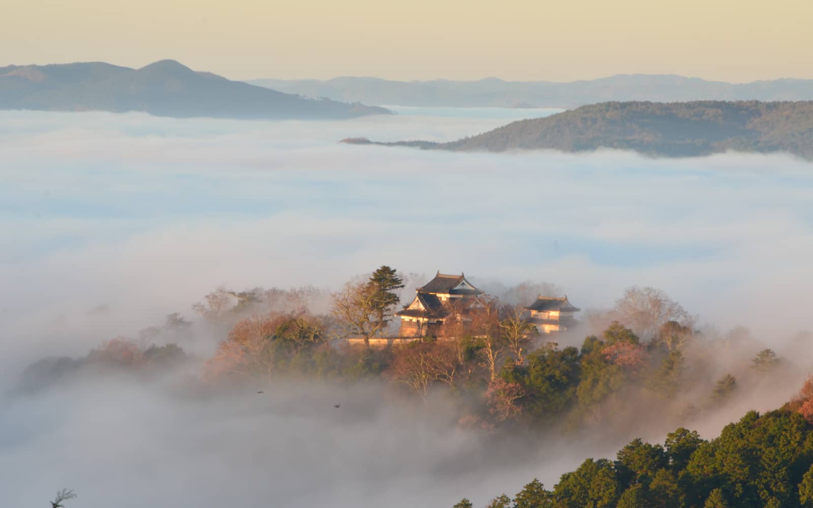 標高430メートルの臥牛山(がぎゅうさん)頂上付近に建つ備中松山城は、日本で天守が現存する唯一の山城。秋から冬の冷え込んだ朝には、霧の海に城だけが顔を出す幻想的な光景が広がり、“天空の山城”と呼ばれる理由を実感できます。朝日を浴びて浮かび上がる天守の姿は、まさに一生に一度は見たい絶景! ふわりと広がる雲海と天守のコントラストに、思わず「きれい…」と声がこぼれます。SNS映えも間違いなしのスポットです。