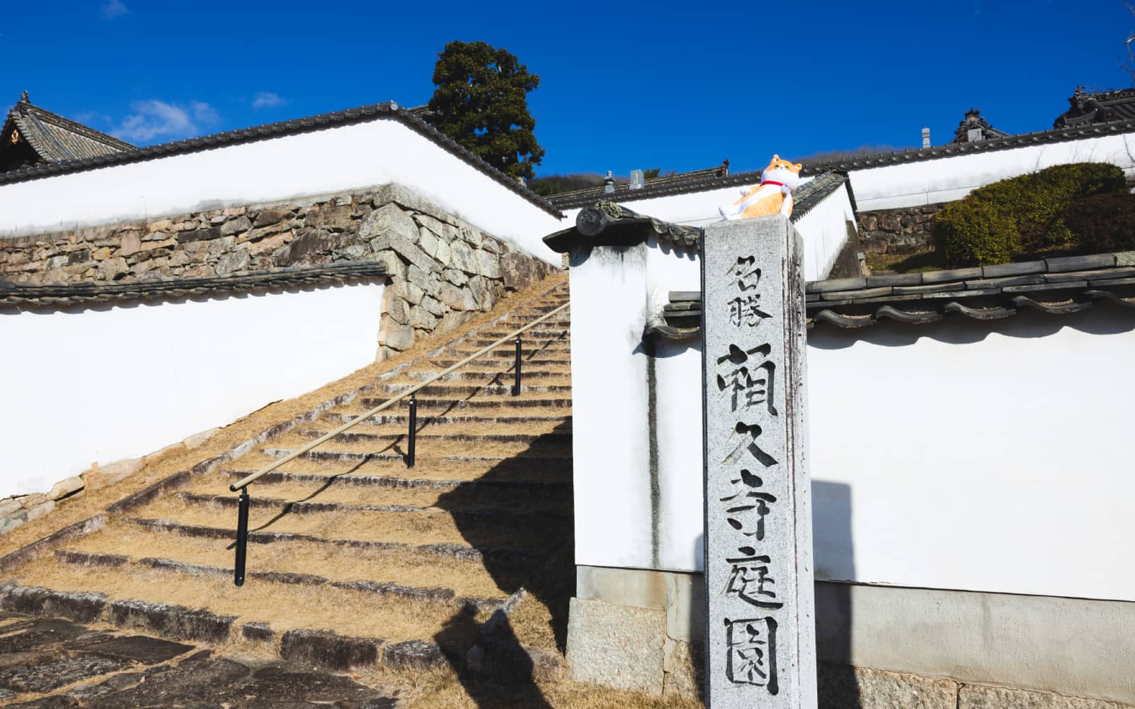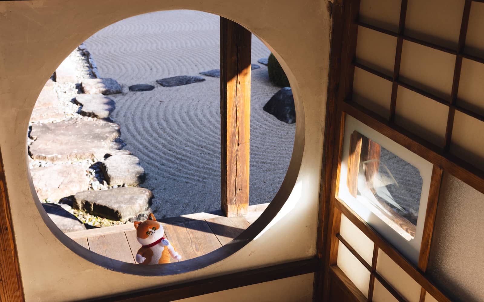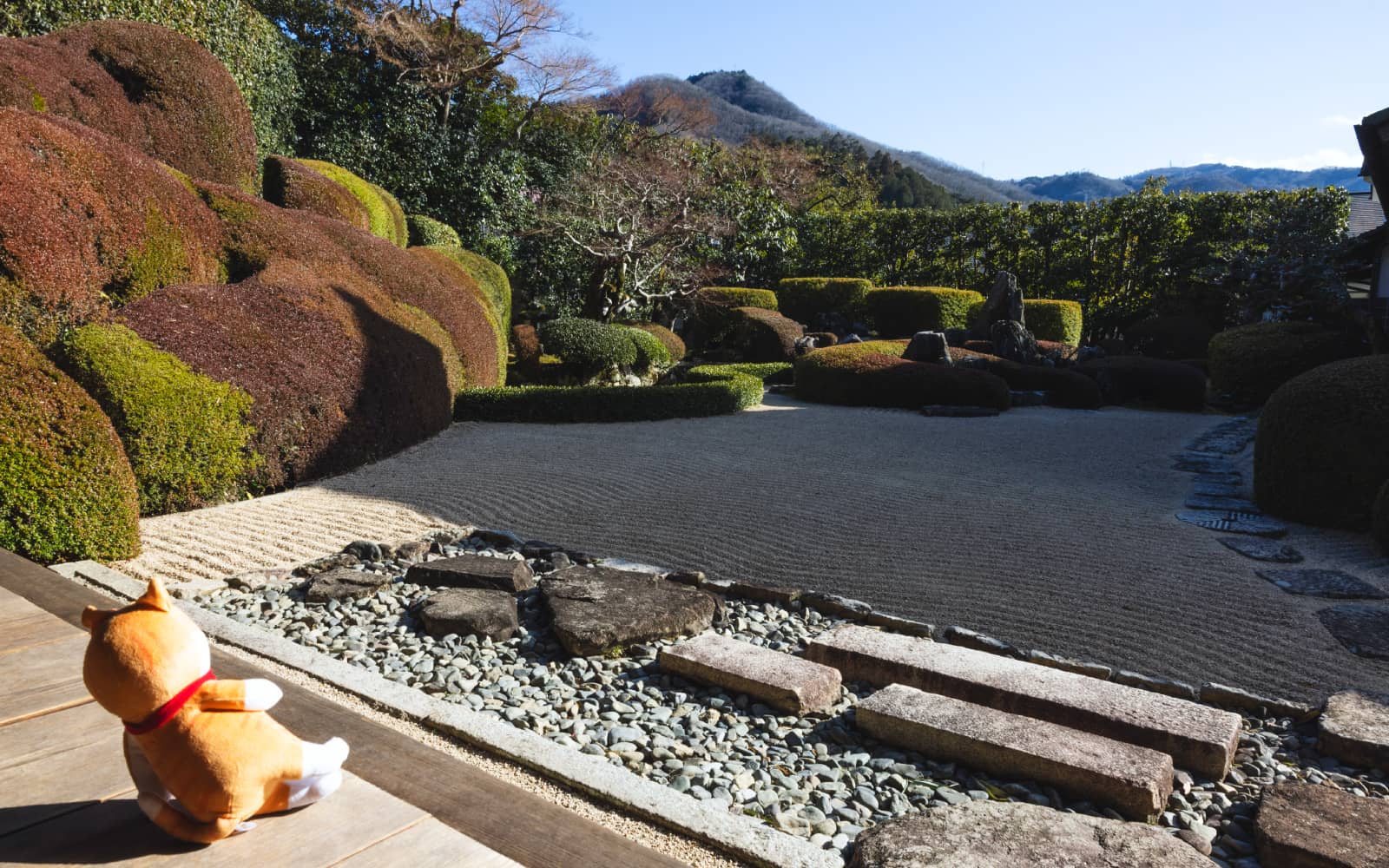 頼久寺の庭園は、備中国奉行として赴任していた小堀遠州が築いた枯山水庭園。「鶴亀の庭」とも呼ばれる名園で、はるかに望む愛宕山を借景に、砂の波紋で海を表し、鶴亀二島を配した美しい構成が特徴です。砂紋と季節の緑が織りなす静かな空間は、日々の喧騒をそっと遠ざけてくれる場所。お気に入りのぬいと並んで、今もなお続く歴史に思いを馳せてみて。