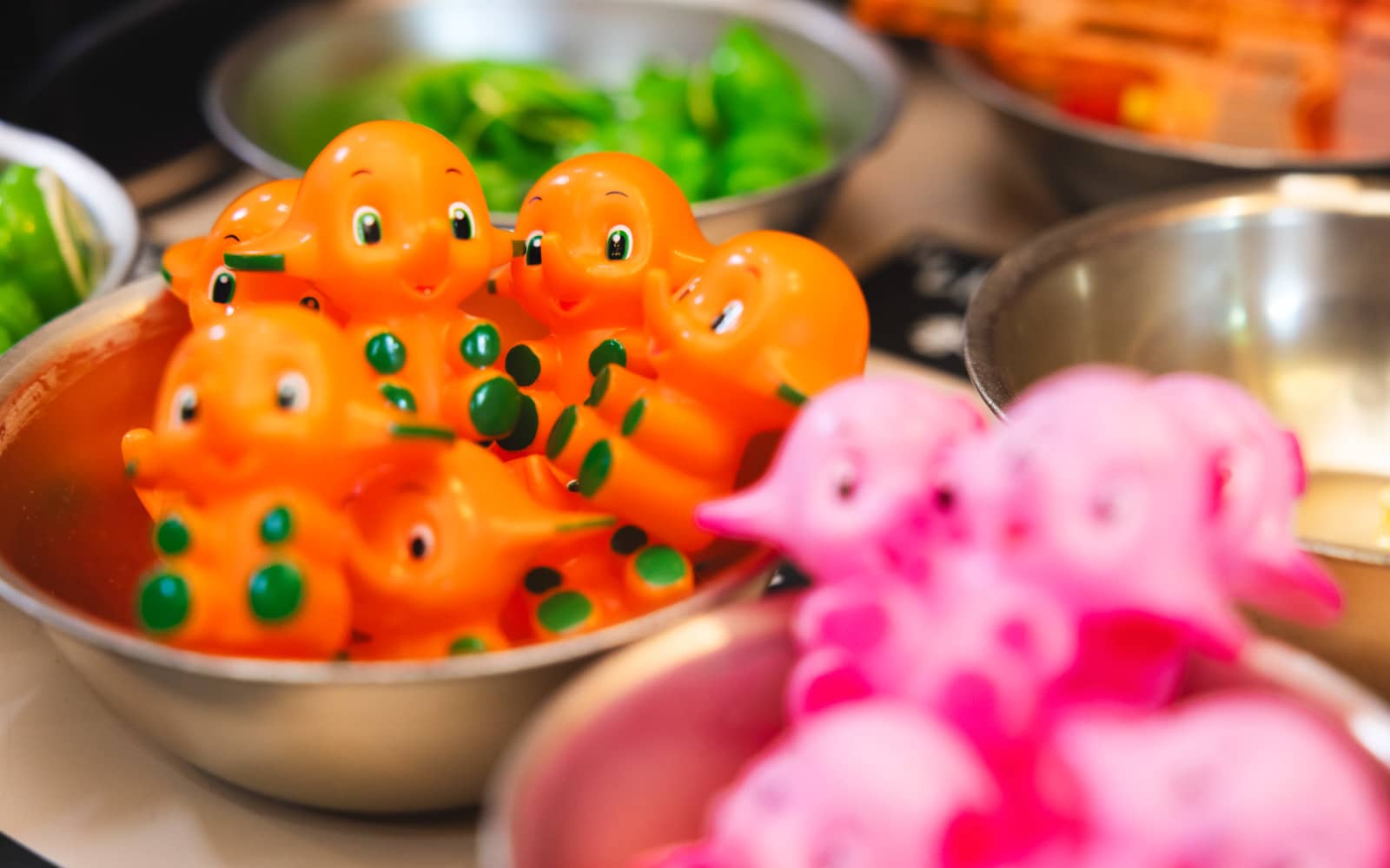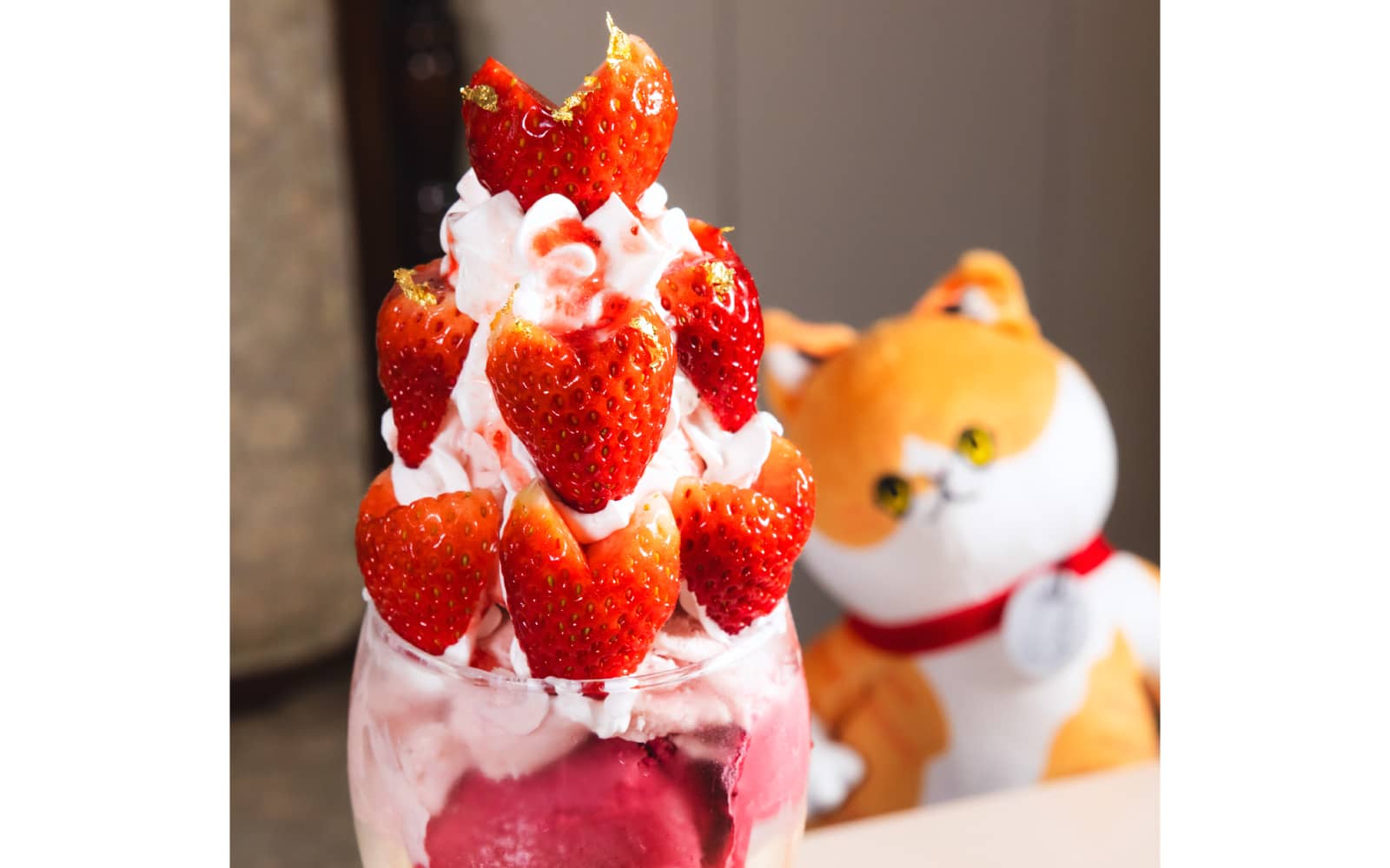 昭和レトロな雰囲気が「エモい!」と若い世代にも大人気のお店。注目は、みんなでシェアしたくなるバケツに入ったインパクト抜群のパフェや、旬の苺を贅沢にあしらった華やかな「苺のブーケ」。心ときめく甘い幸せに、ぬいも思わずニッコリ。