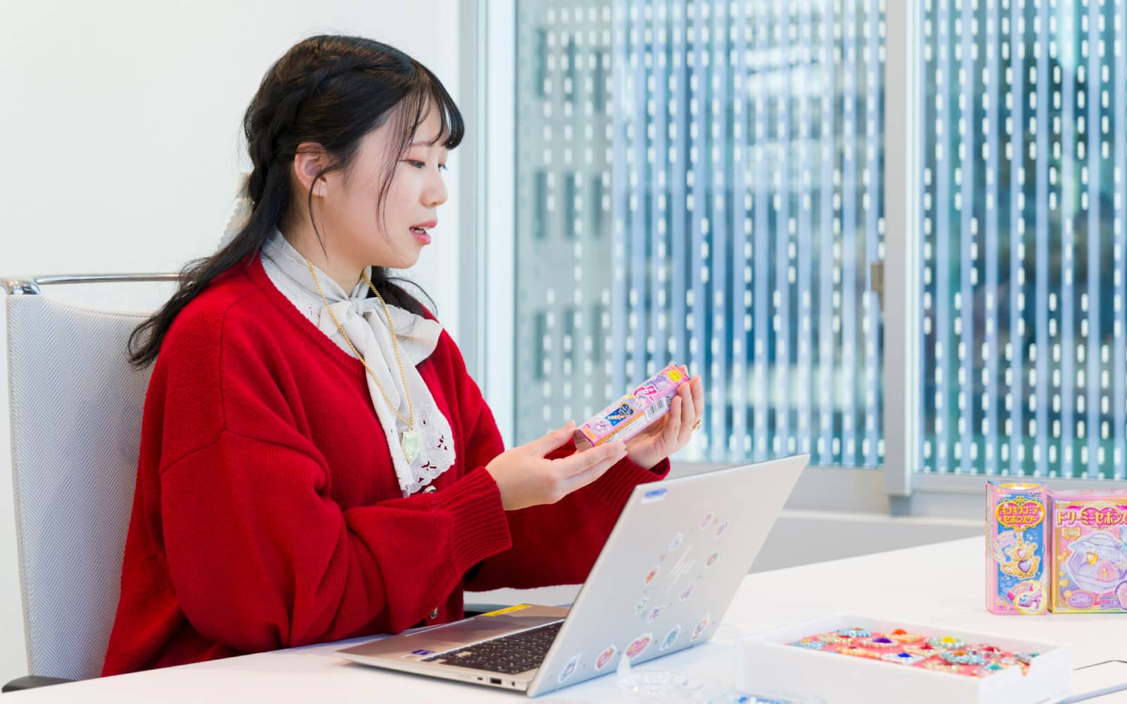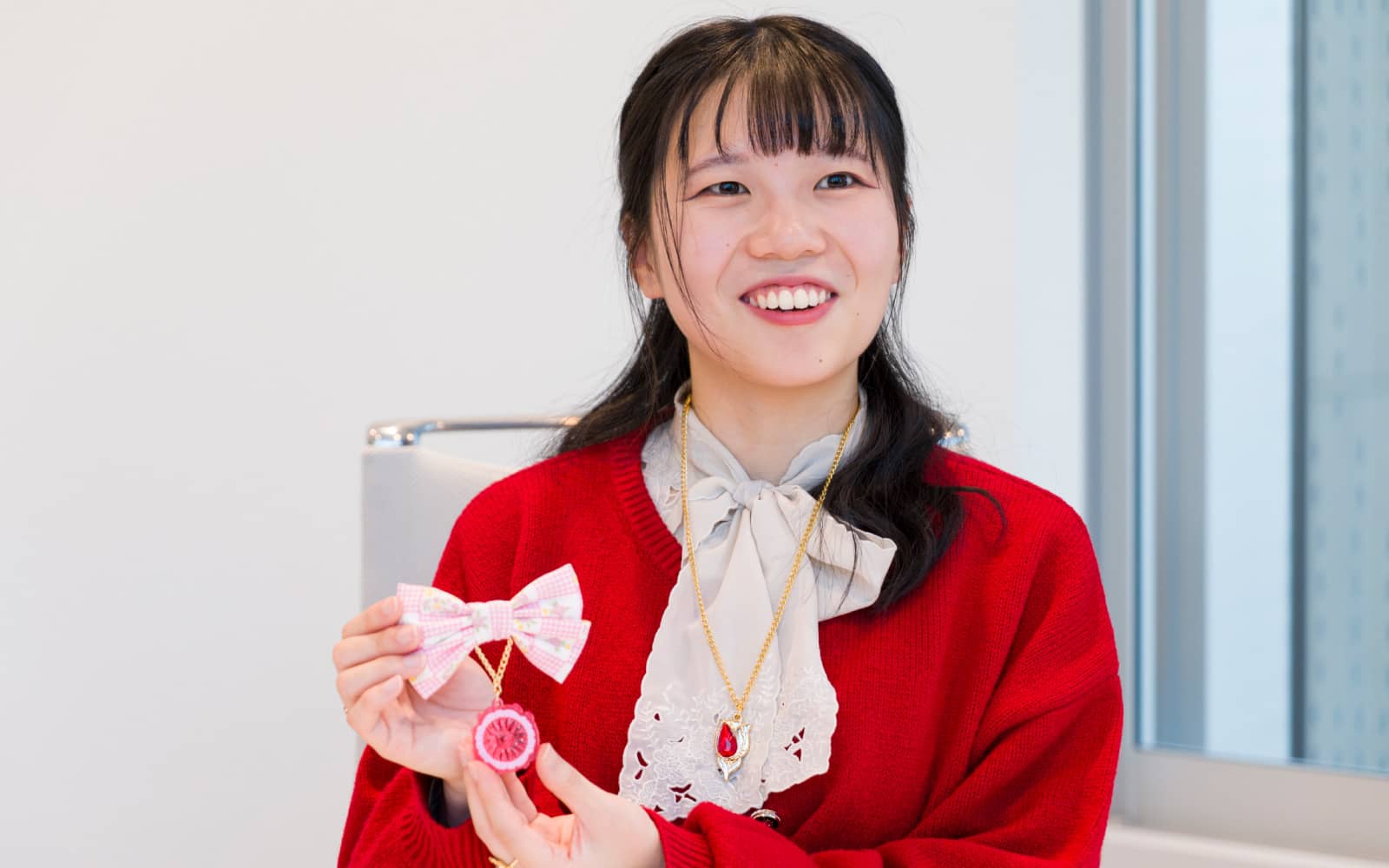 実は私、もともと『セボンスター』の大ファンだったので、カバヤ食品に入社しました。毎日『セボンスター』を身につけて出社するくらい大好きです。今日は、一番お気に入りのチューリップモチーフのもの。その日つける『セボンスター』に合わせたコーデを考えるのがとても楽しいです!